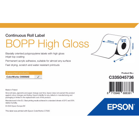 Epson's original continuous roll BOPP labels with a semi-gloss finish provide balanced image quality and good legibility. The material is resistant to moisture, spills and mechanical impact, making it ideal for everyday packaging and product labelling.