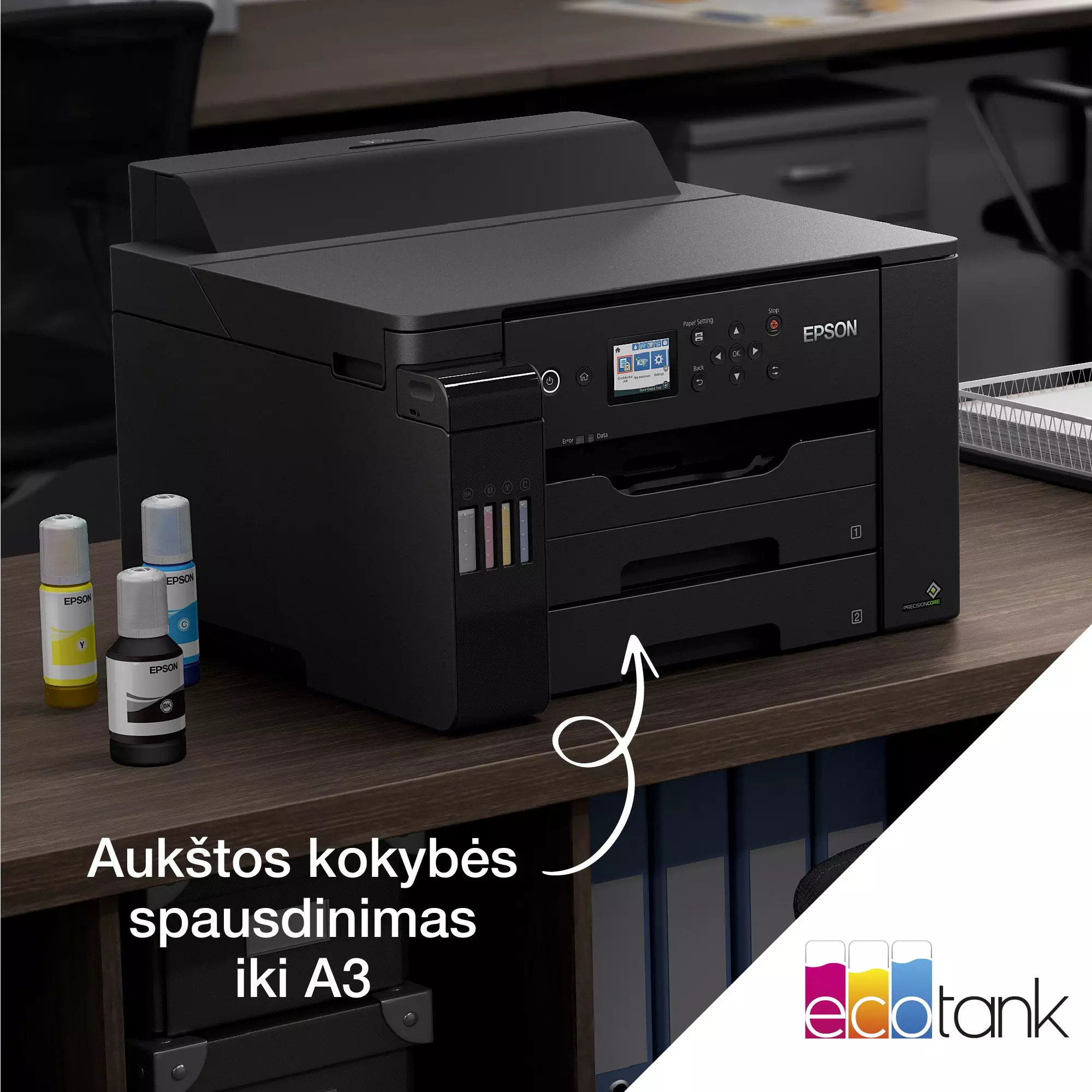 Epson EcoTank L11160 – funkcijų gausa pasižymintis A3+ formato rašalinis spausdintuvas, skirtas nedideliems biurams ir verslams, kuriems svarbus našumas ir maža vieno puslapio kaina. Jis leidžia greitai atlikti A3+ formato darbus dėl didelės spausdinimo spartos, dviejų 250 lapų A3 formato priekinių dėklų ir 50 lapų galinio tiektuvo. Talpios rašalo talpyklos užtikrina itin ekonomišką spausdinimą, o pigmentinis rašalas suteikia profesionalią dokumentų kokybę.