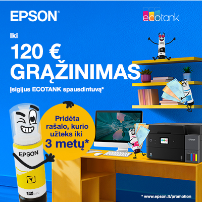 Epson akcija! Susigrąžinkite 120 € iš Epson, įsigiję EcoTank spausdintuvą. Daugiau informacijos apie akciją > ČIA <