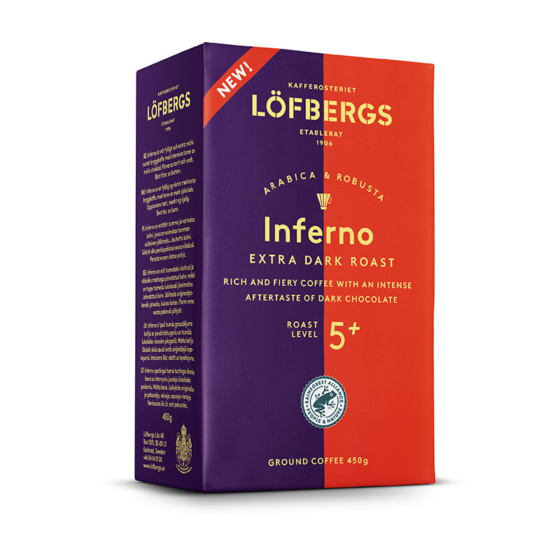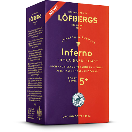 Löfbergs Inferno — это смесь зёрен арабики и робусты экстратёмной обжарки с насыщенным вкусом и нотками тёмного шоколада. Этот кофе отлично сочетается с горячими молочными напитками или эспрессо для тех, кто любит крепкий кофе.