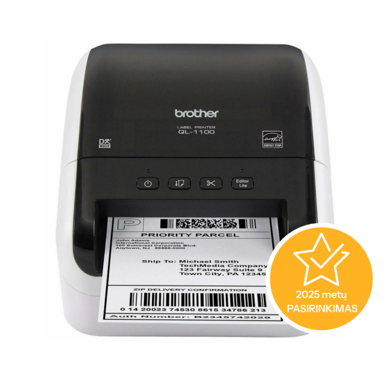 QL-1100c, turintis 4 colių (101,6mm) pločio spausdinimo galvutę, užtikrina maksimalų suderinamumą su trečiųjų šalių siuntų etikečių programinės įrangos paketais iš kurjerių ir siuntų pristatymo įmonių.